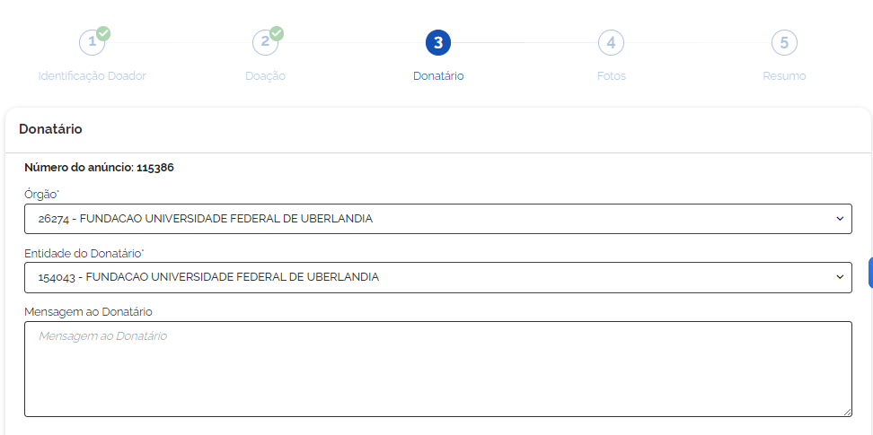 ATENÇÂO! No momento do anúncio, o doador deve indicar a UFU para receber a doação. Caso não faça isso, o bem pode ser doado a qualquer outro ente público que manifestar interesse no bem. Para isso, ao preencher o anúncio informe que possui donatário por meio do campo abaixo