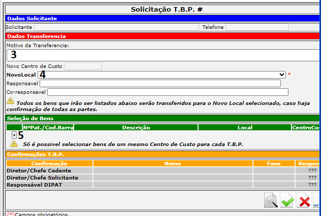 A Transferência de Bens Patrimoniais (T.B.P.) é utilizada quando o usuário está de posse de um bem que não está na lotação devida.